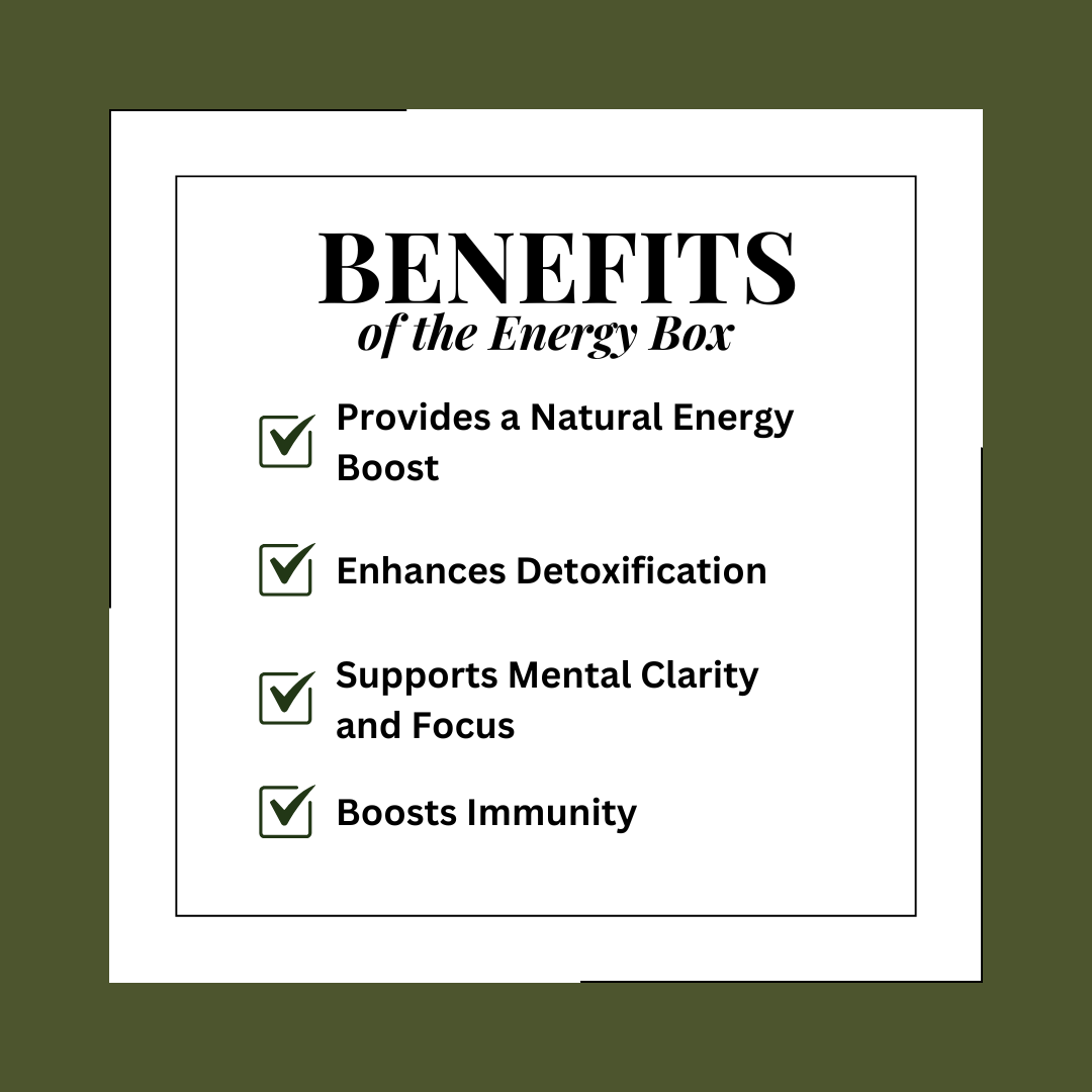Fuel your day with the ultimate energy boost from our Energy Box! This carefully curated collection of cold-pressed juices is designed to hydrate, energize, and refresh, so you can stay active and feel your best. Each 8 oz bottle is packed with natural ingredients that provide sustained energy without the crash.