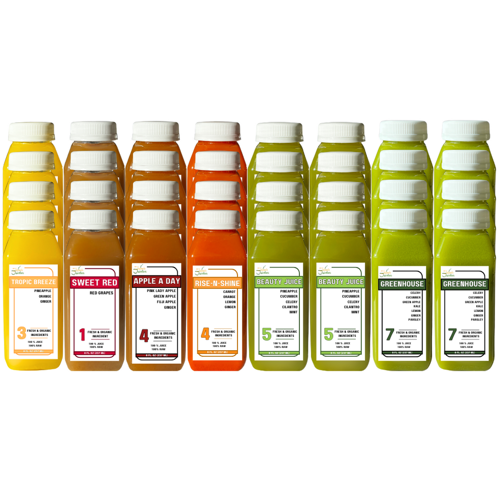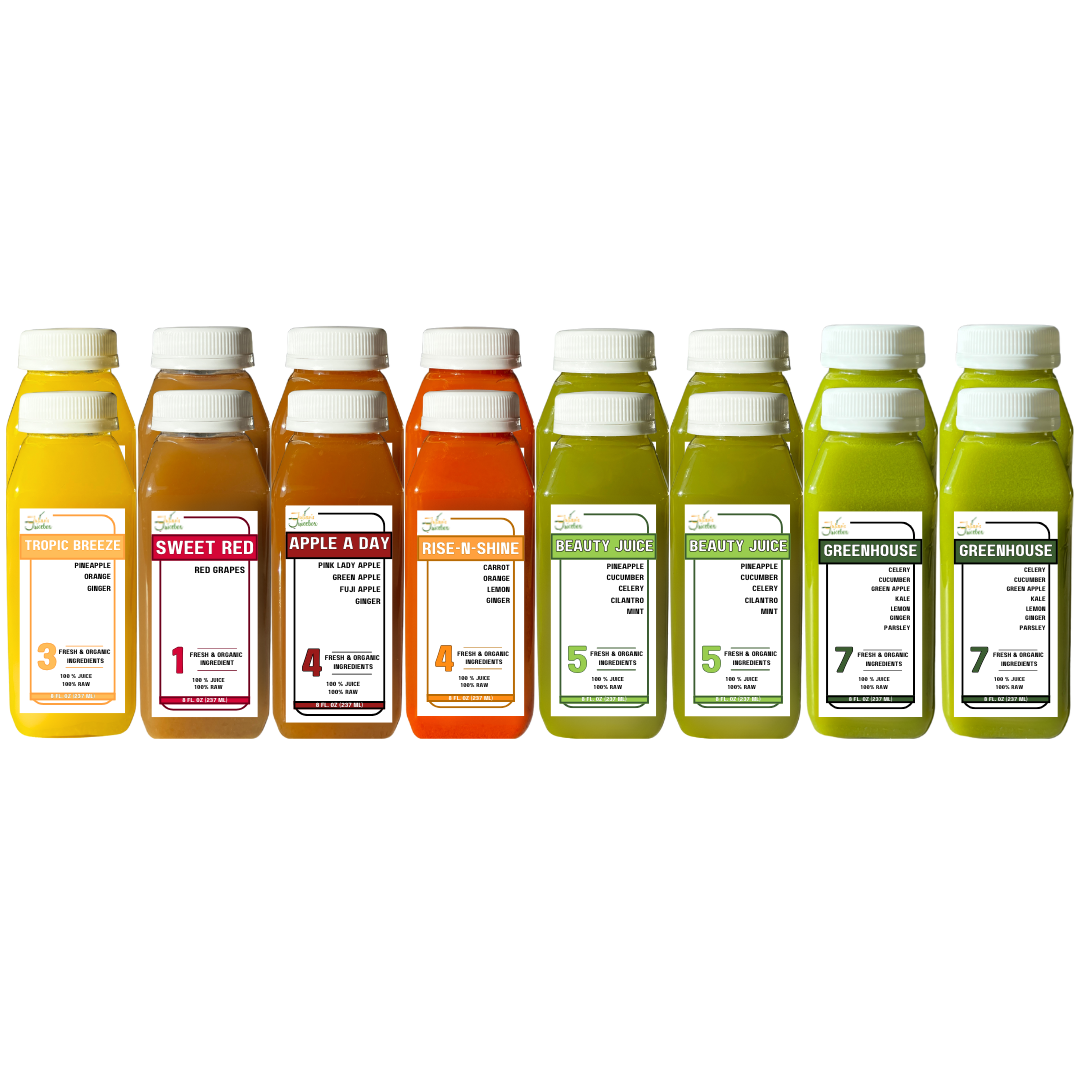 - Beauty Juice: Organic Pineapple, Cucumber, Celery, Cilantro & Mint to support skin health and detoxify your body.